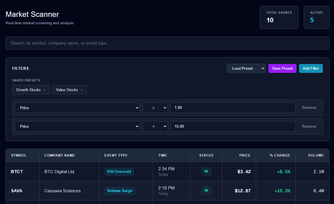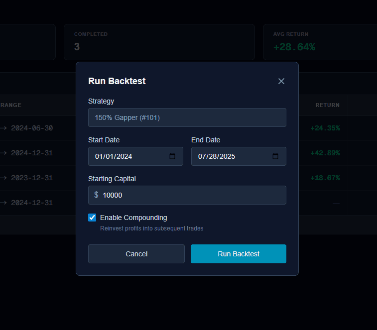 Our engine is optimized for U.S. equities with a special focus on intraday small-cap behavior (gappers, spikes, mean-reversion, etc.). We use high-resolution minute-level data and corporate action adjustments to ensure accuracy. Additional asset classes will be added based on user demand.