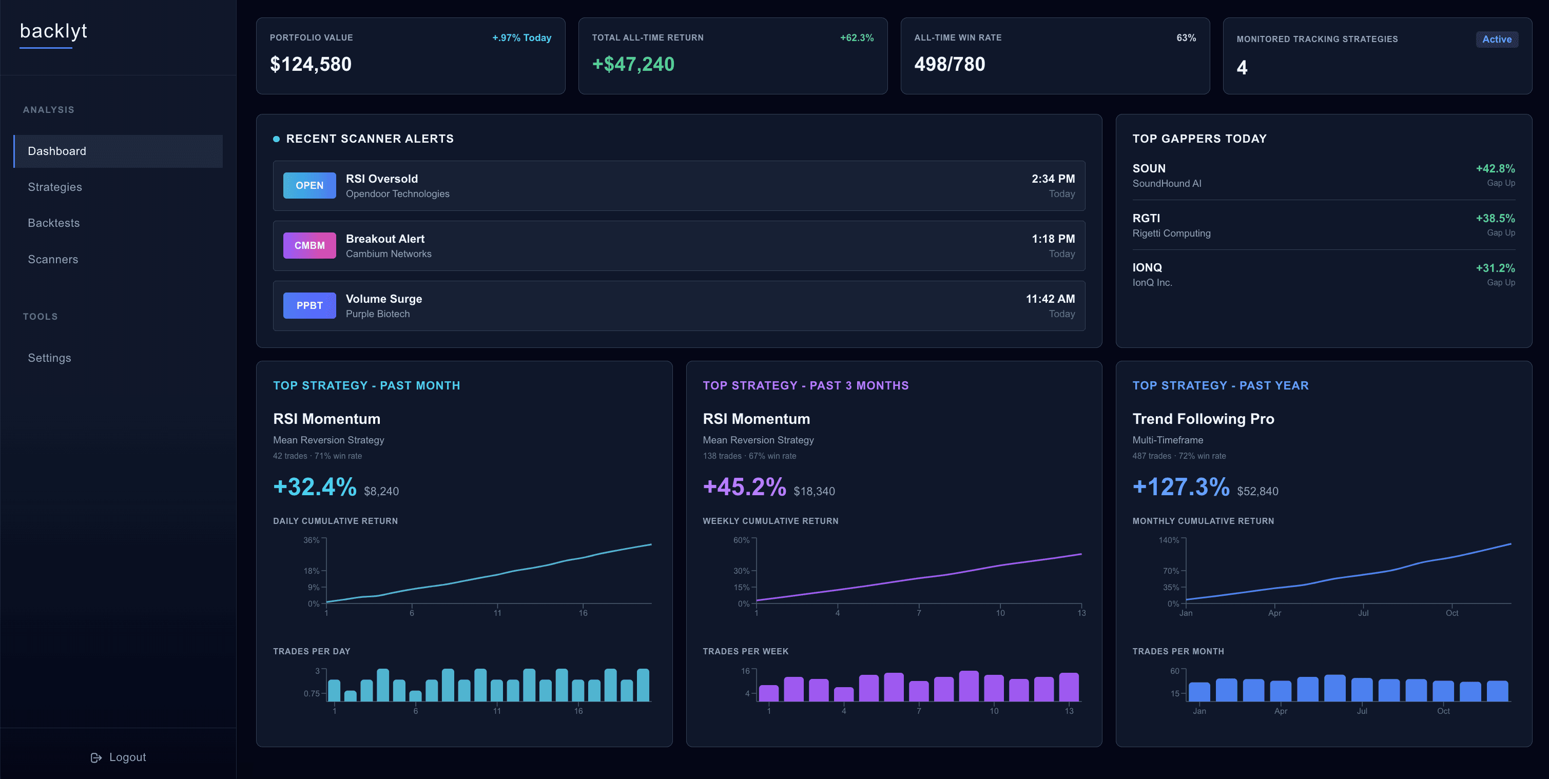 Backlyt is built to give traders with no desire to code the ability to build and test complex strategies